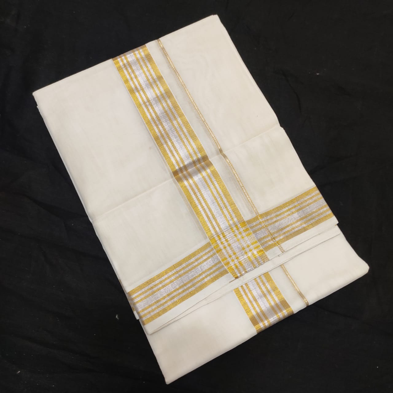 Home / Premium Handloom / Premium Dhoties / Dhothi / 2″ Golden-Silver Jari Striped Design Handloom Dhoti/Veshti