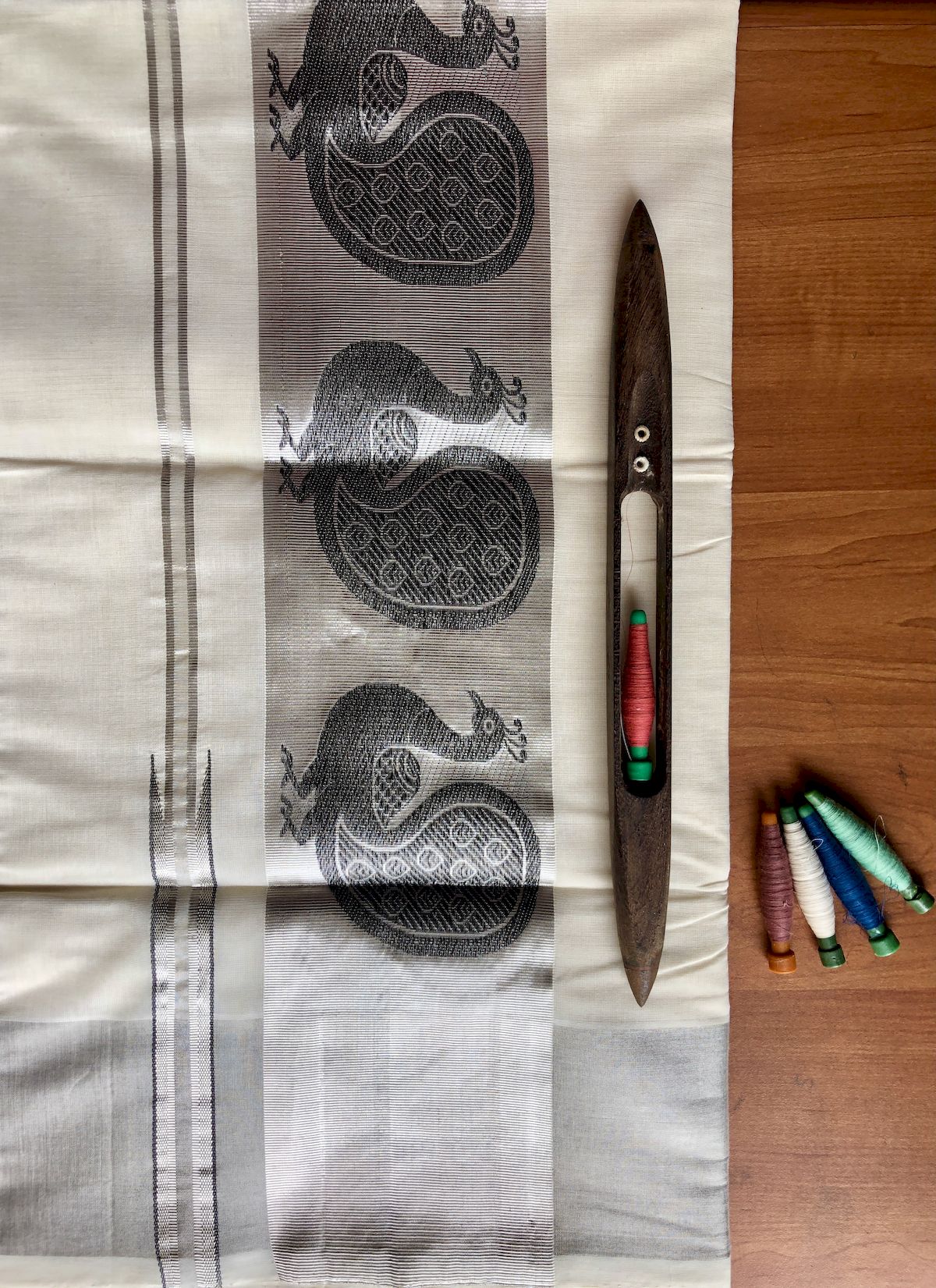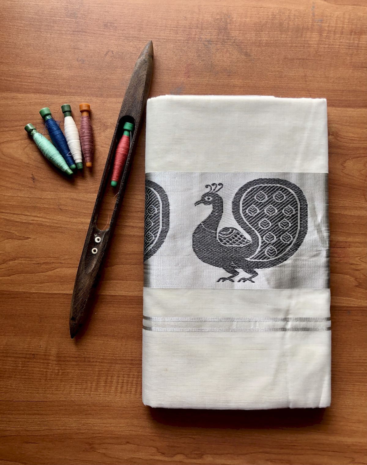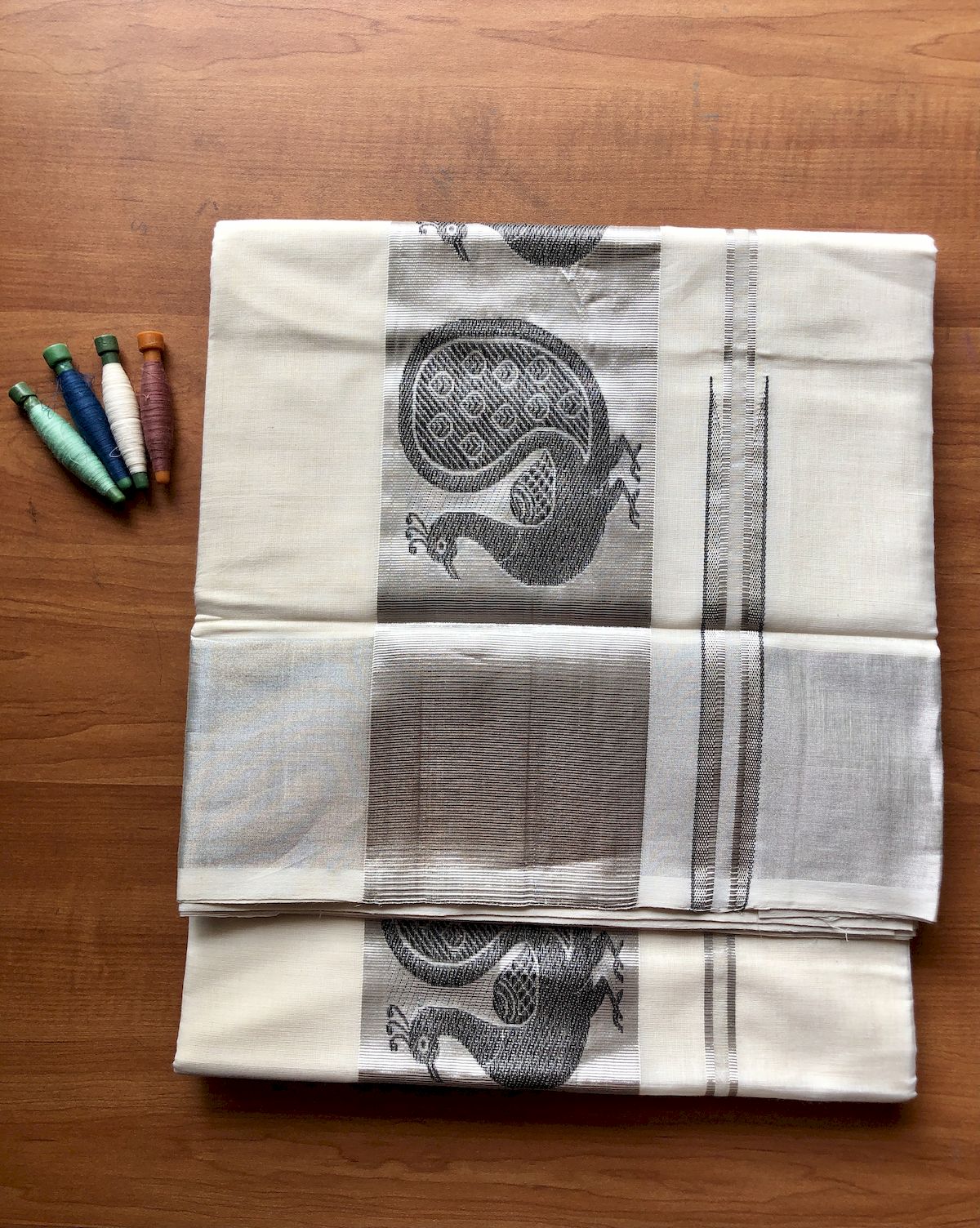 Home / Premium Handloom / Kerala Sarees / 4.5″ Silver Jari with Peacock Design Fancy Saree