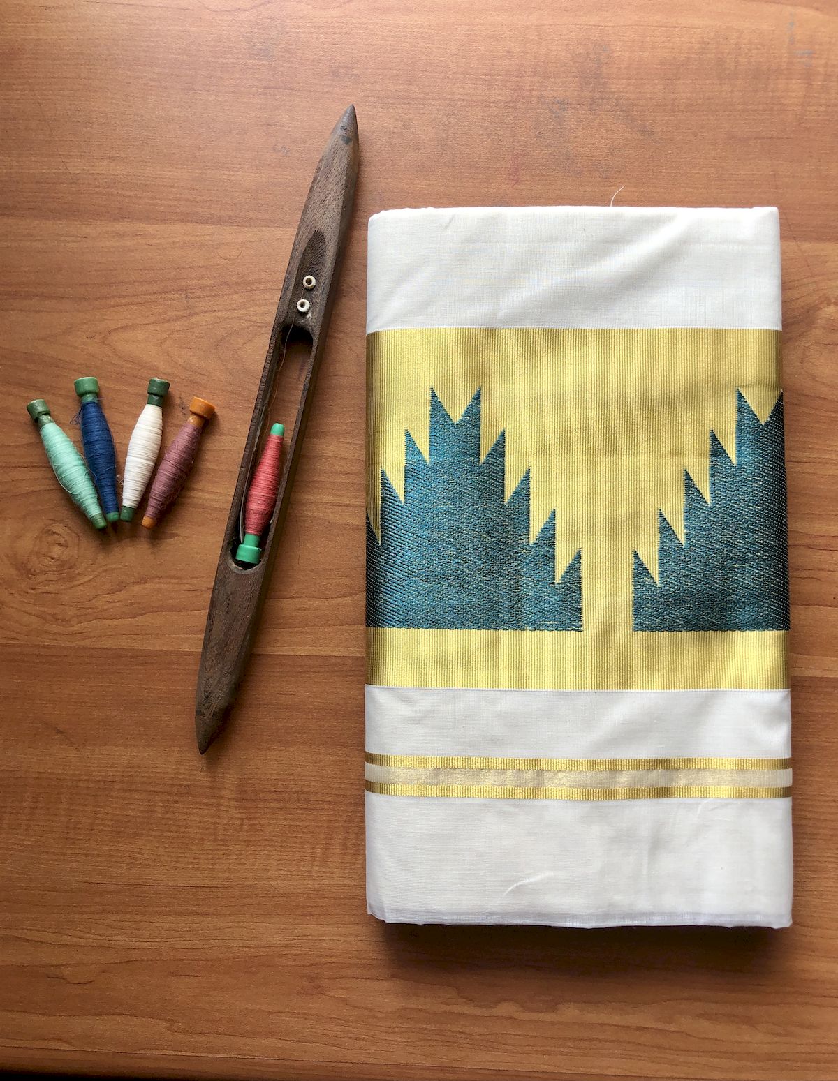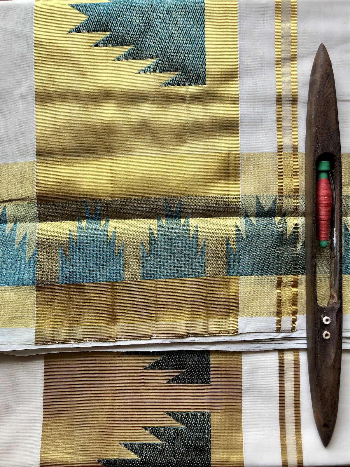 Home / Premium Handloom / Kerala Sarees / 6.5″ Golden Jari with Green Komma Design Fancy Saree