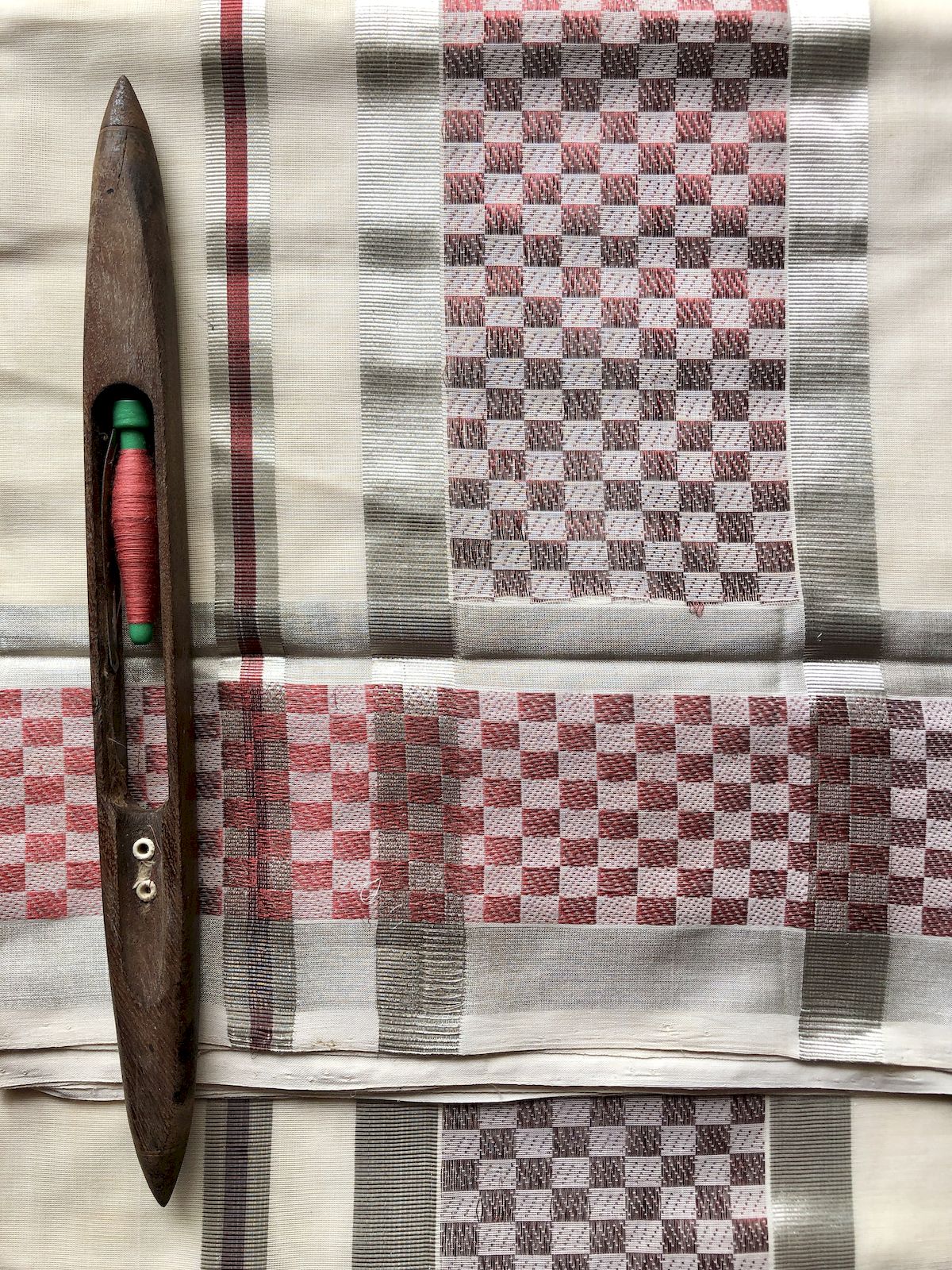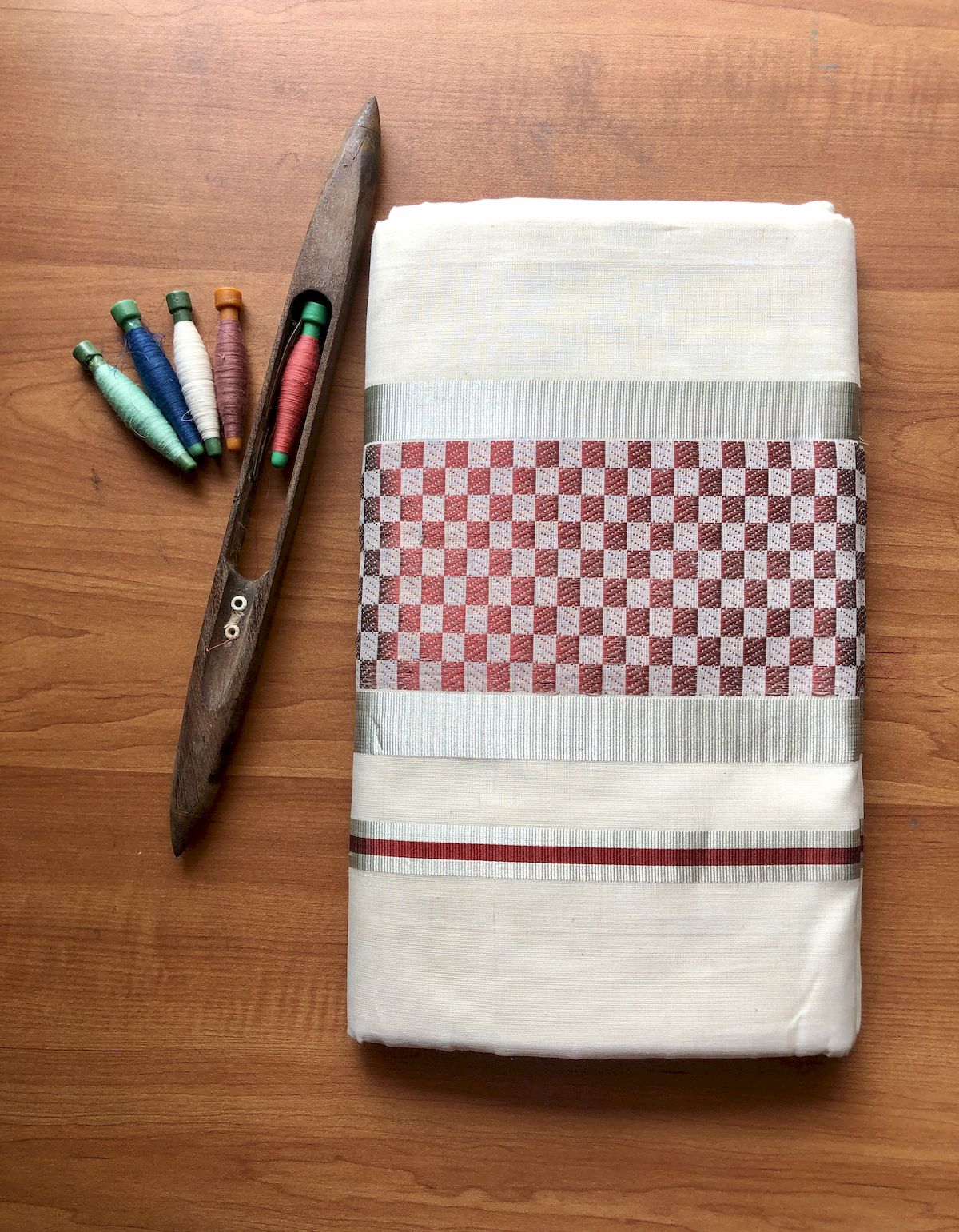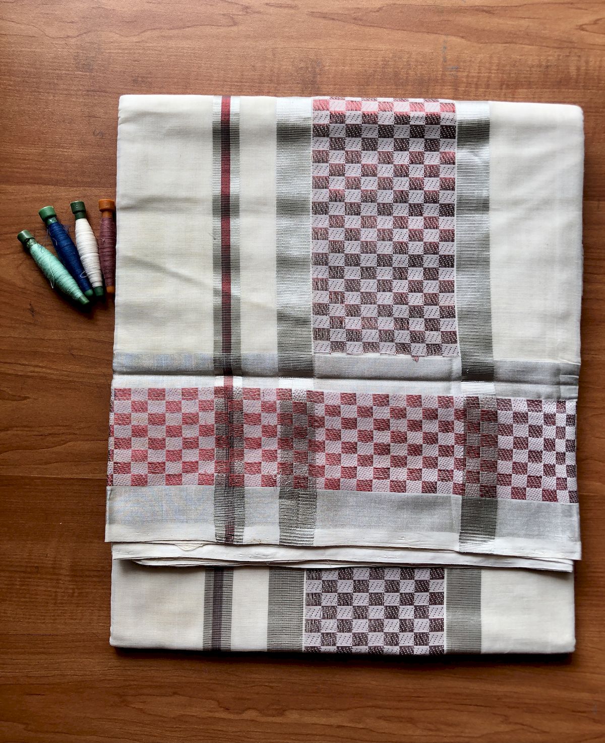 Home / Premium Handloom / Kerala Sarees / 6″ Silver Jari with Meroon Checkered Design Fancy Saree