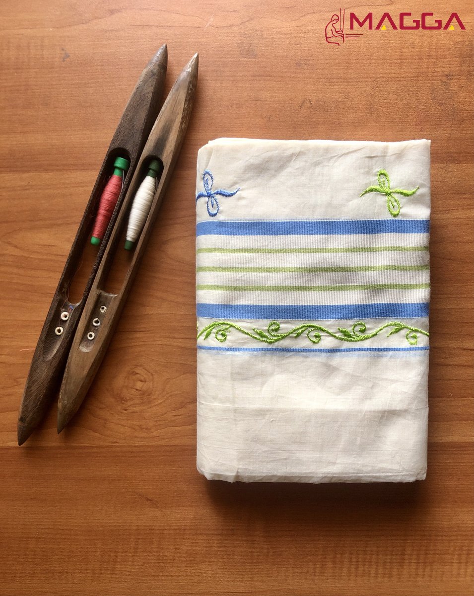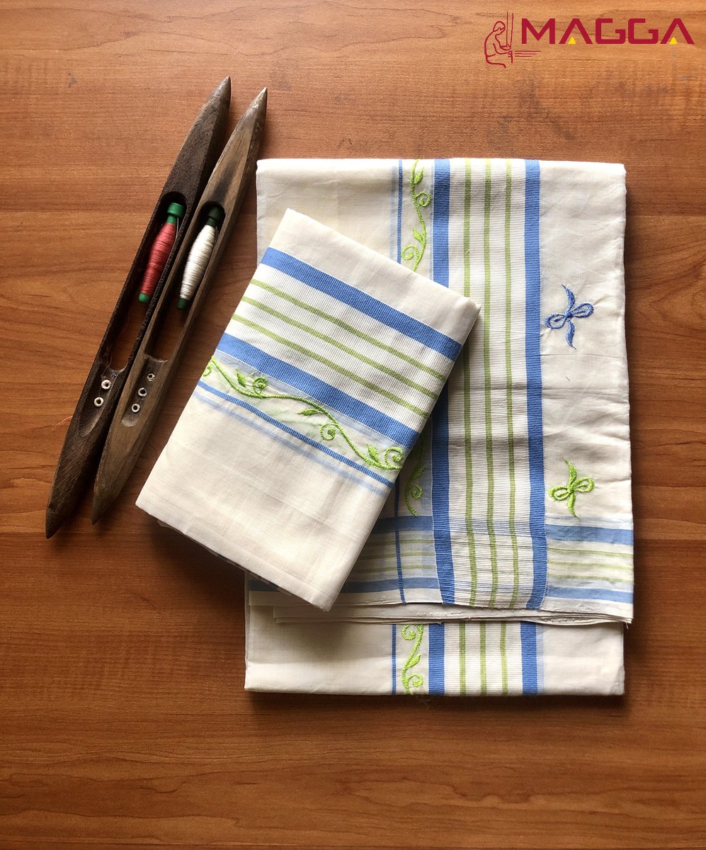 Home / Premium Handloom / Premium Set Mundu / Blue & Green Embroidery Designer Set Mundu