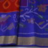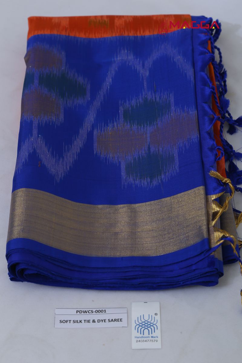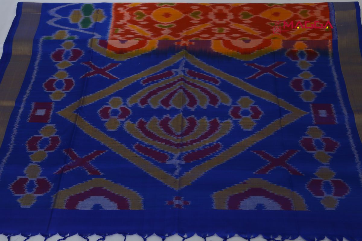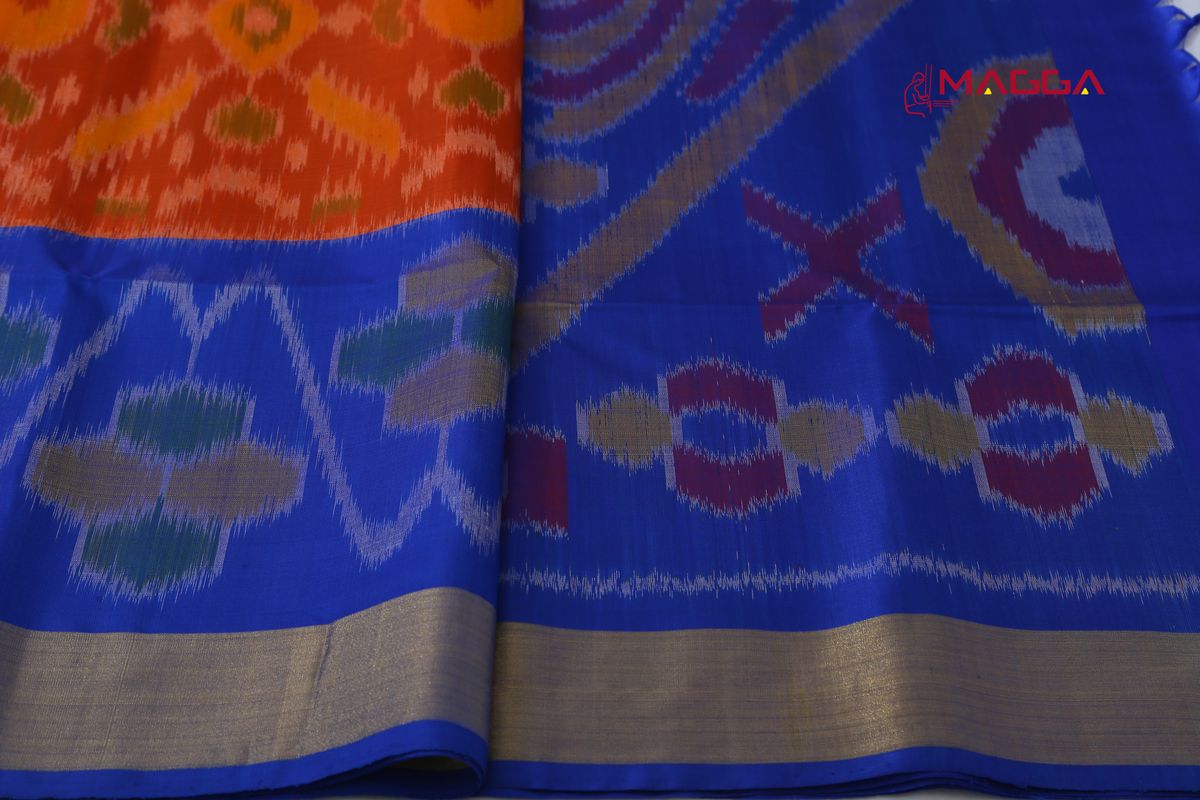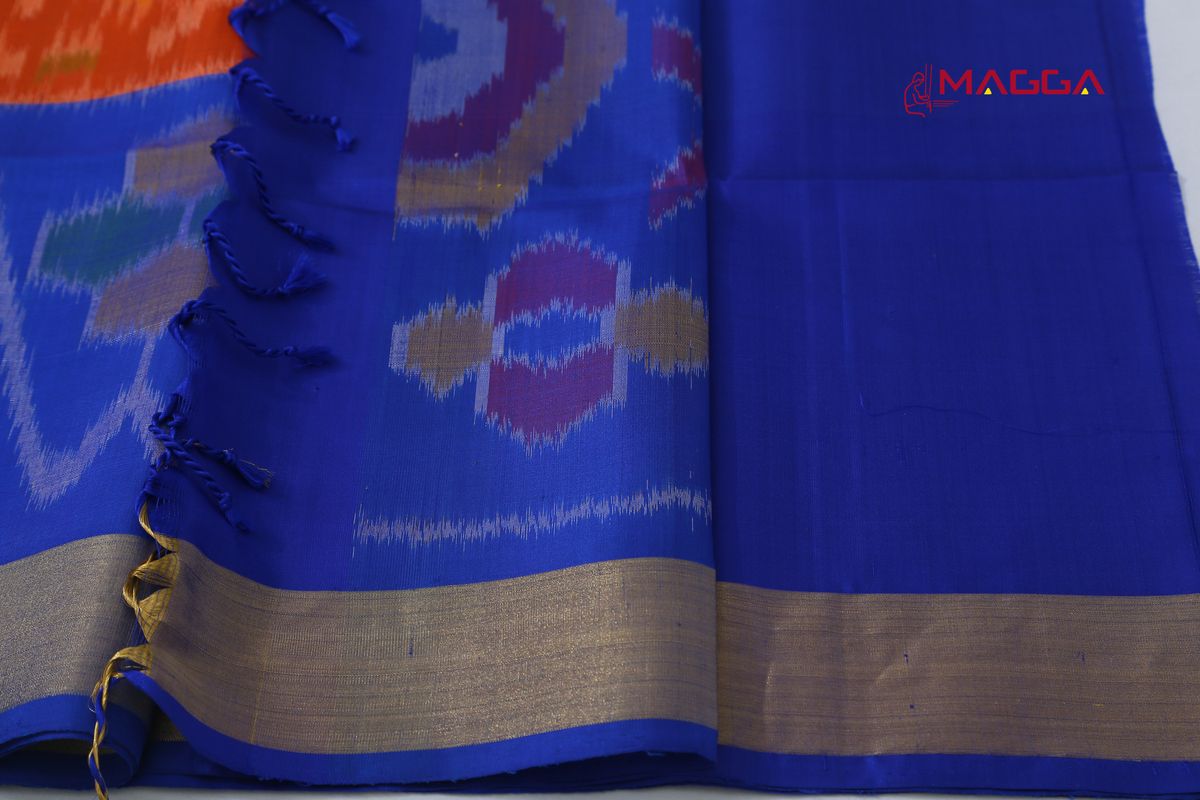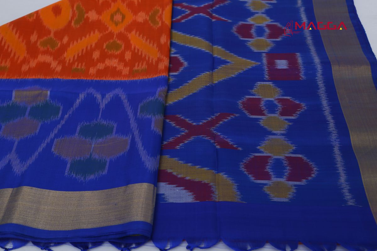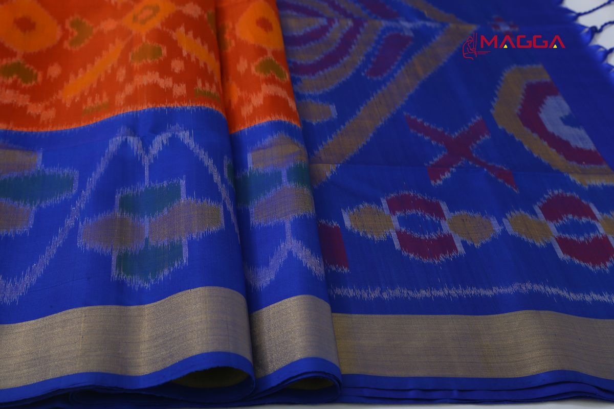 Alluring Handwoven Ikkat Soft Silk Saree in Orange And Blue Coloured with running blouse.