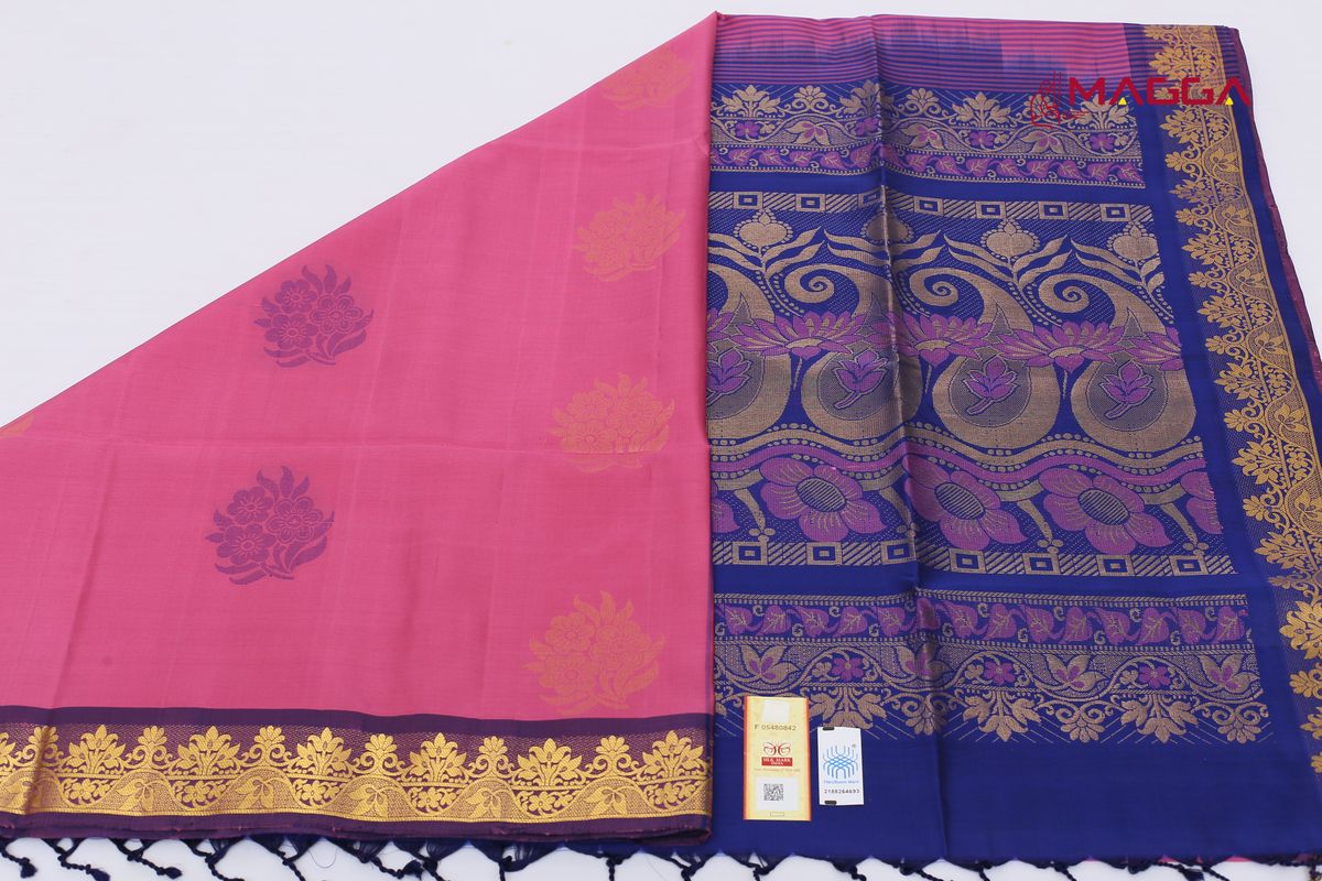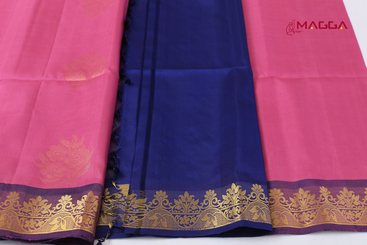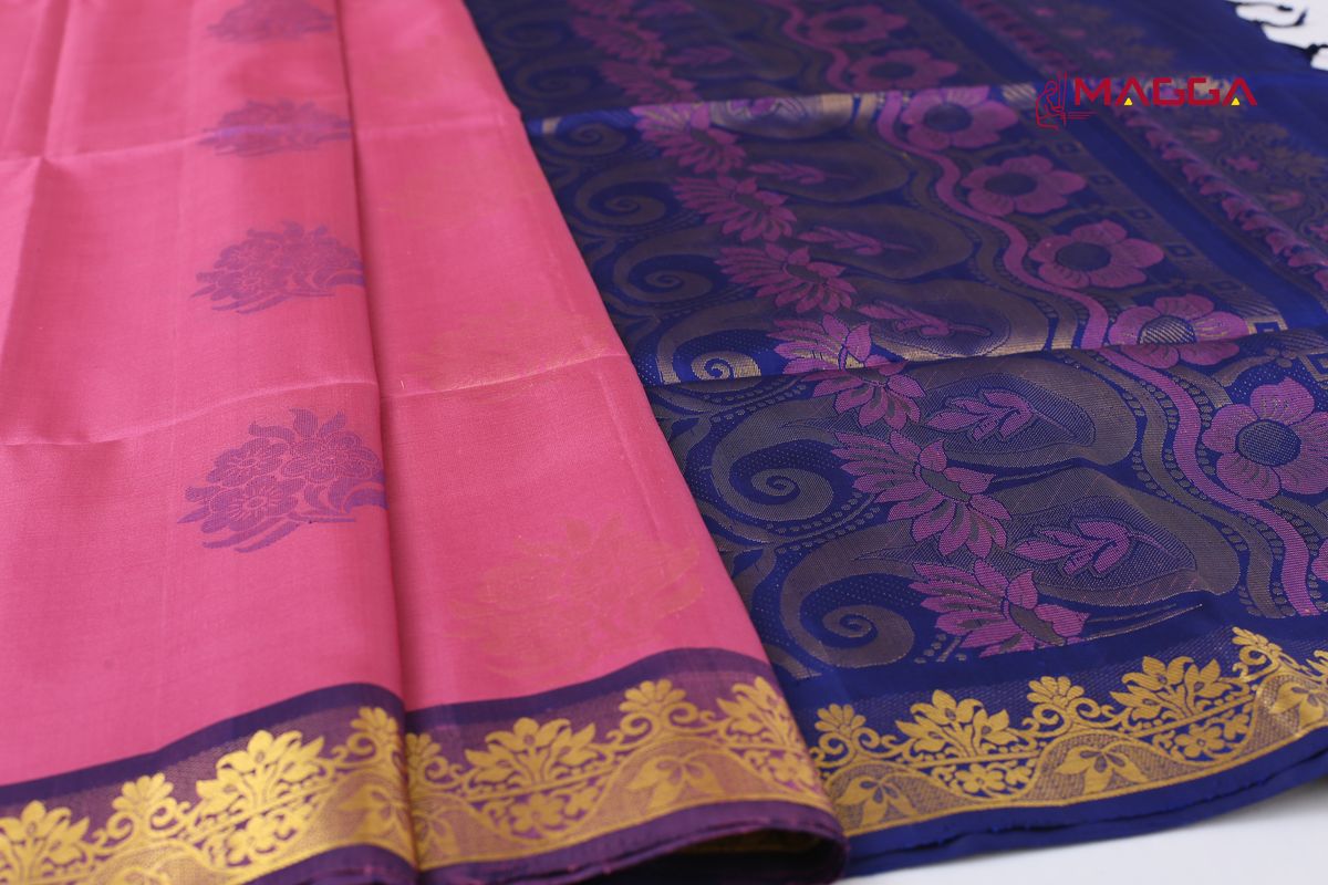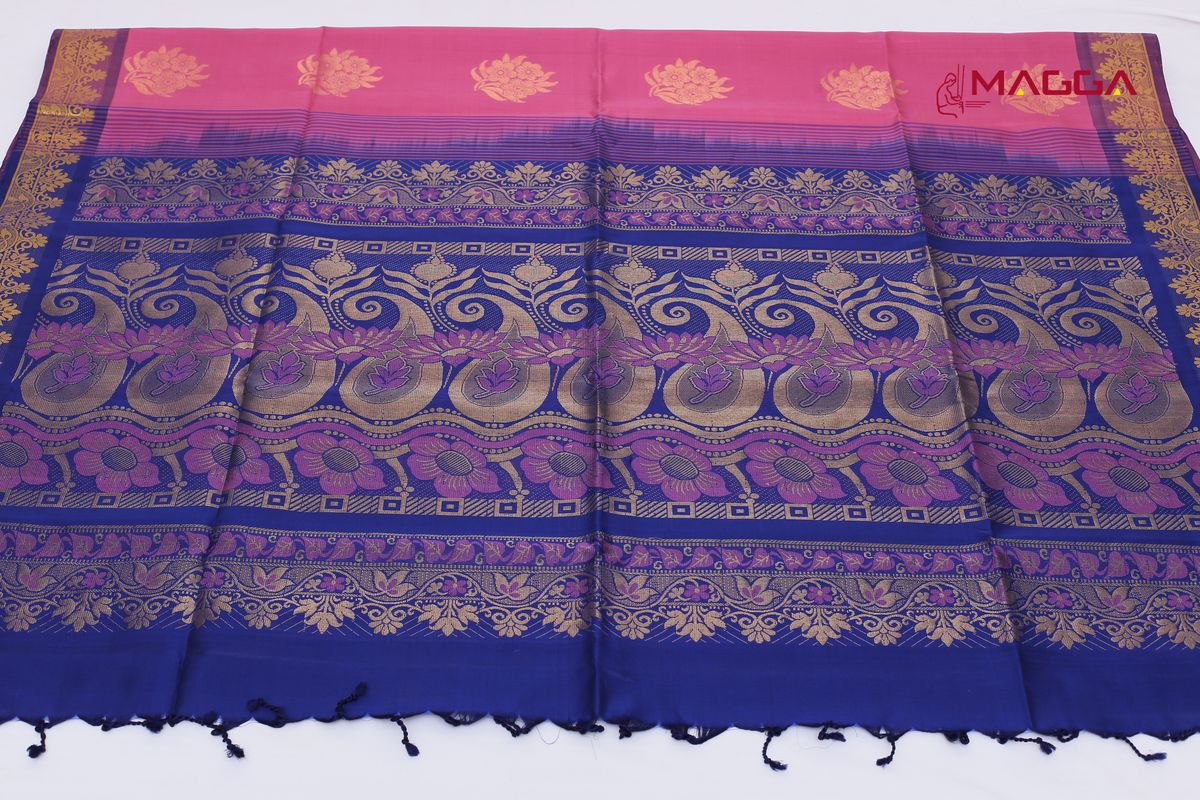 Pink coloured Soft Silk Saree with heavy rich violet Pallu with pure golden Zari and running blouse.