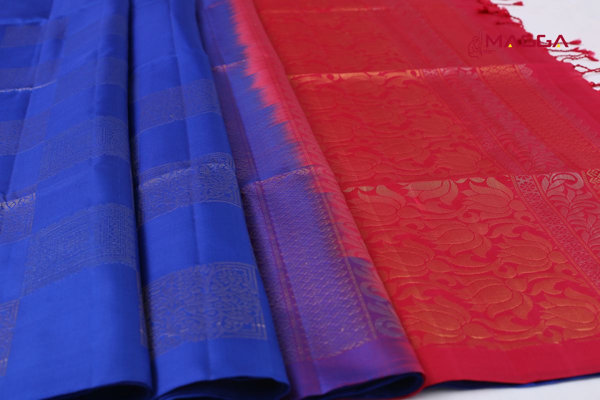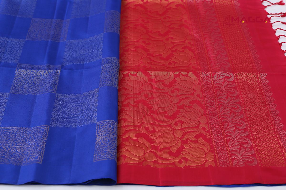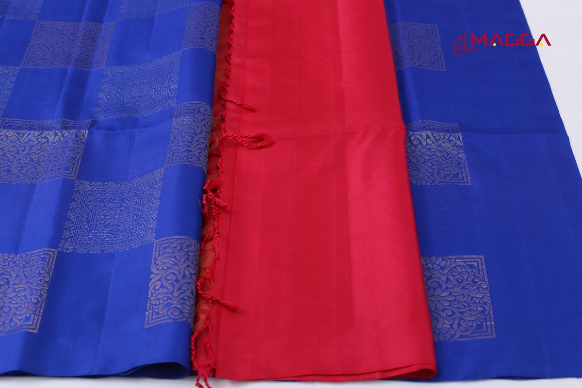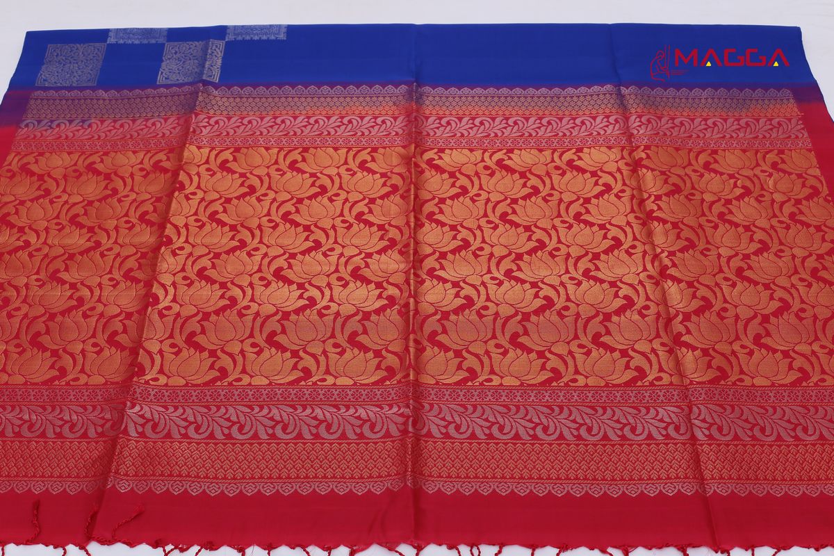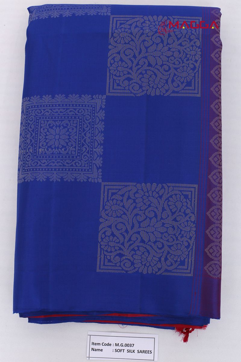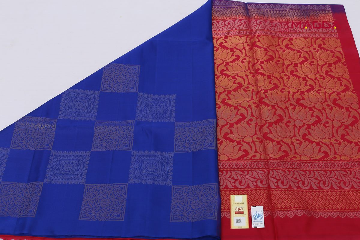 A Royal Blue Soft Silk Saree huge square butta all over body. This saree is intricately woven with open border and huge golden zari design and has rich pallu paired with contrast blouse.