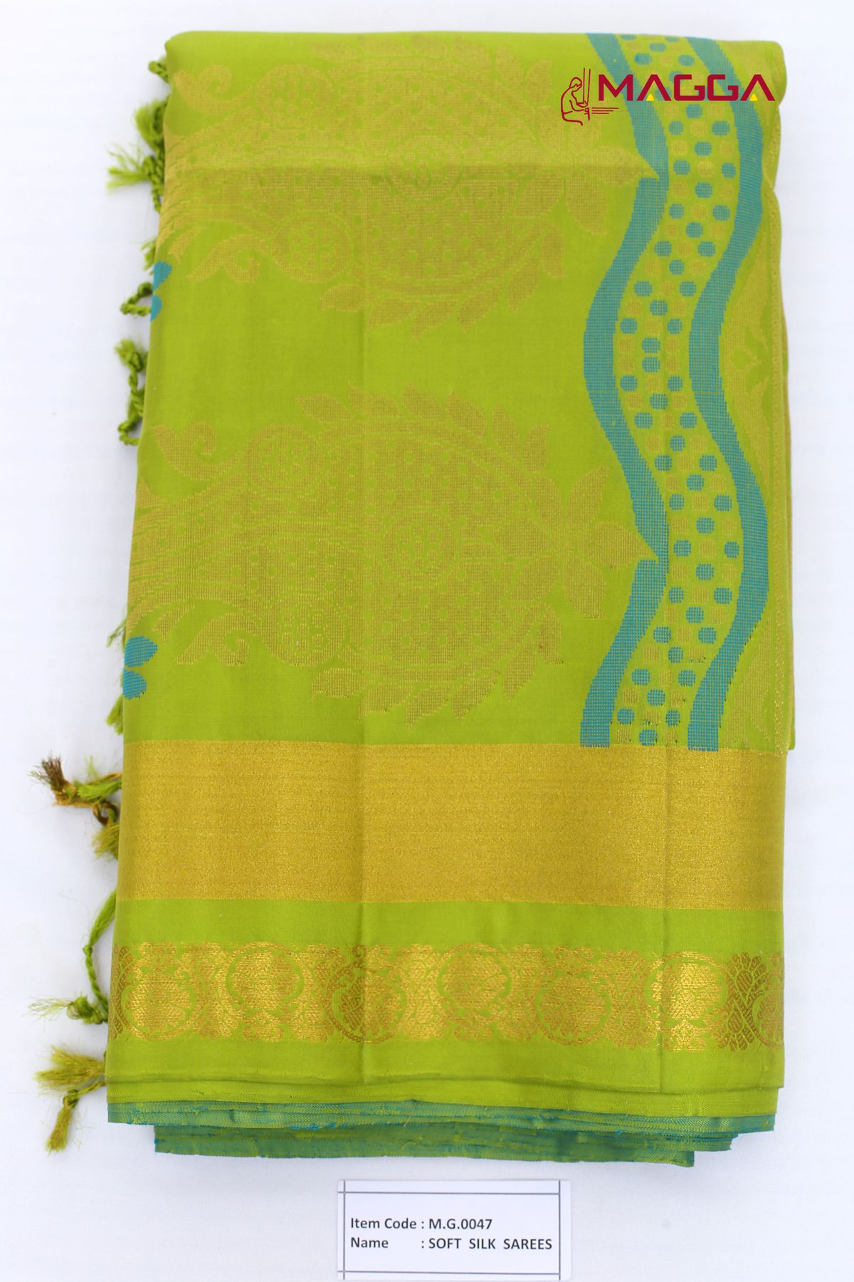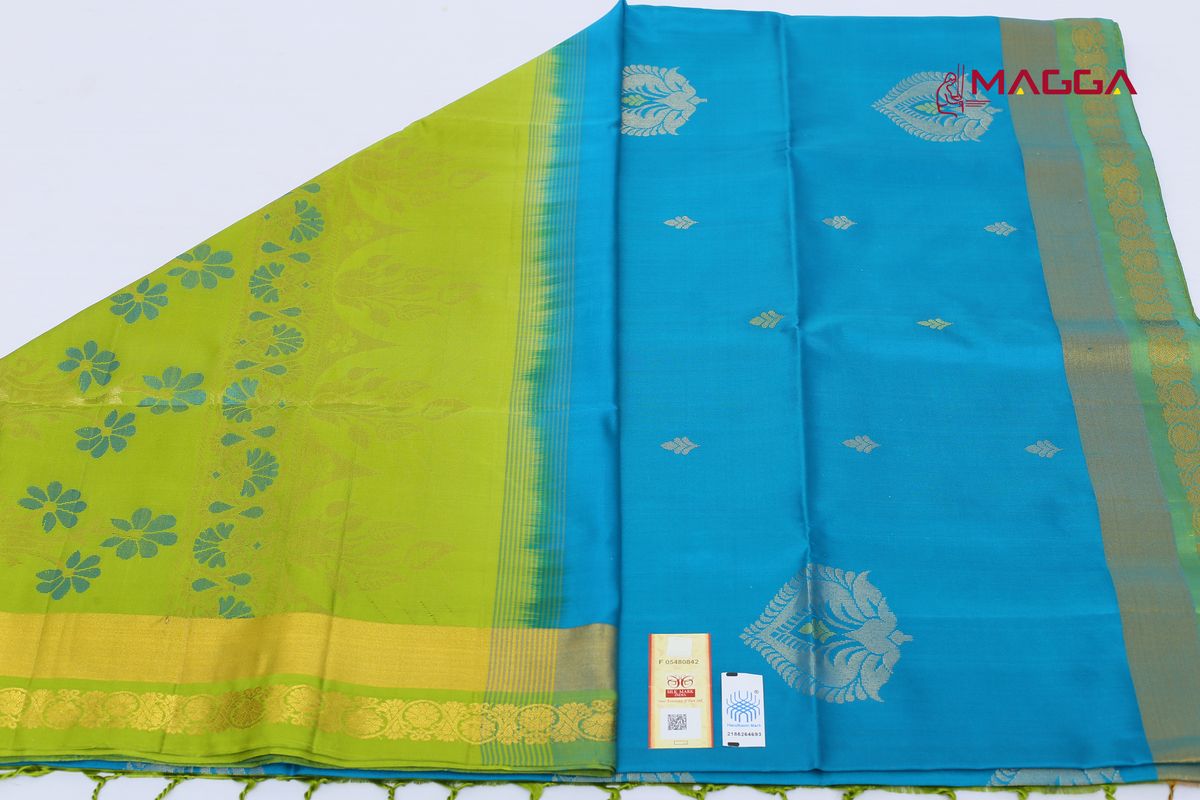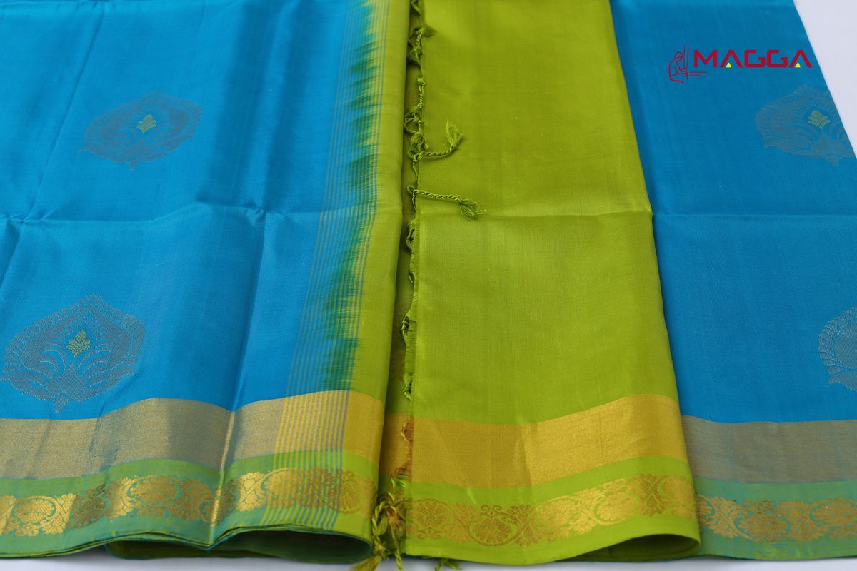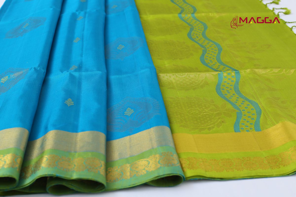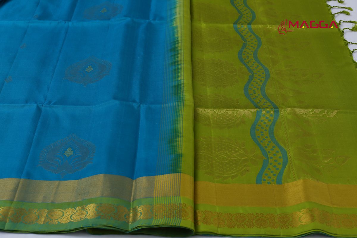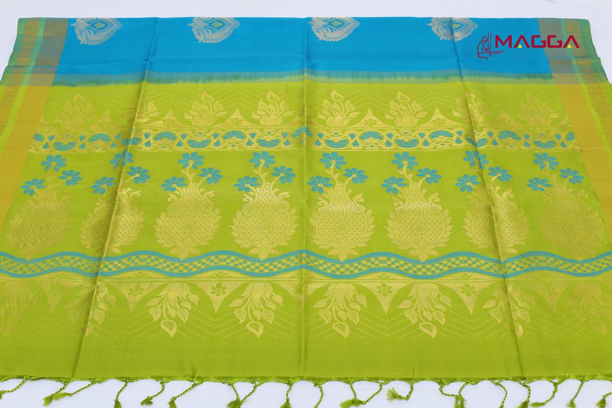Sky blue coloured Soft Silk Saree with heavy rich green Pallu with pure golden Zari and running blouse.