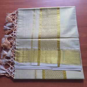 Premium Kerala Cotton Gold jari saree with block prints and running blouse