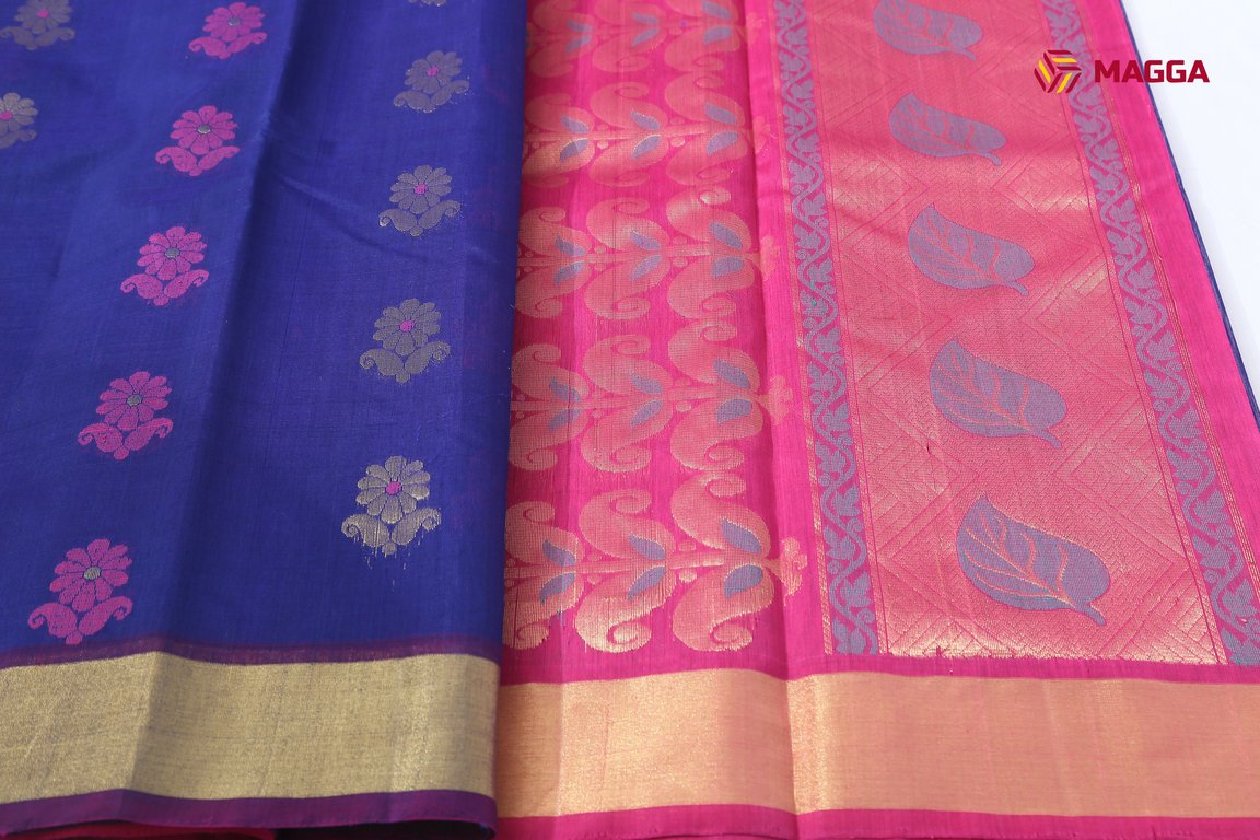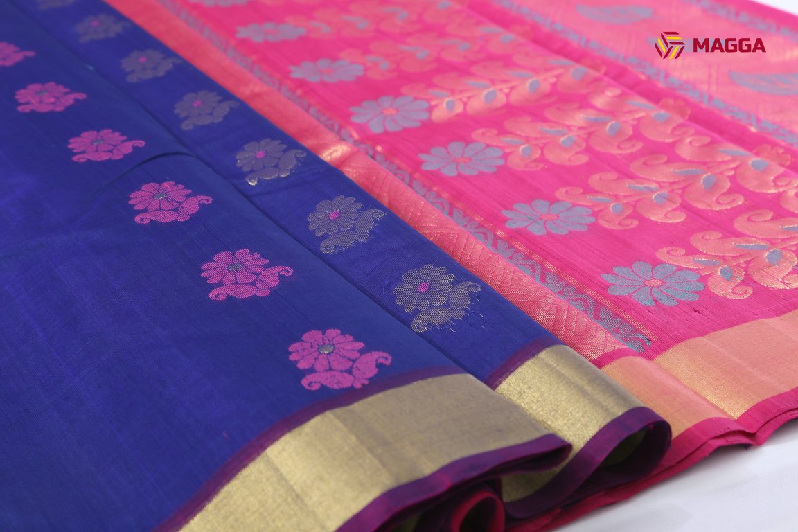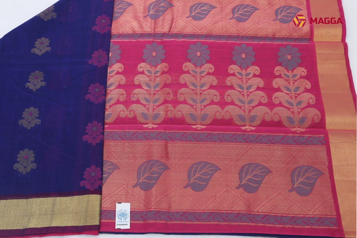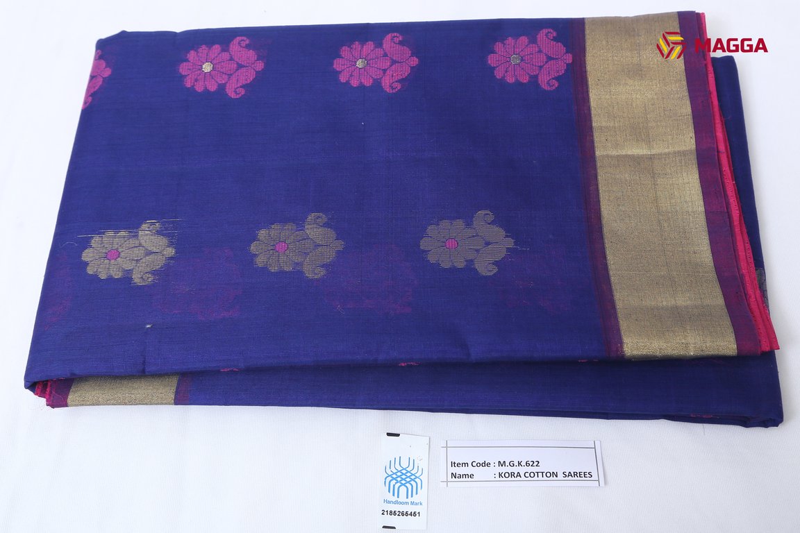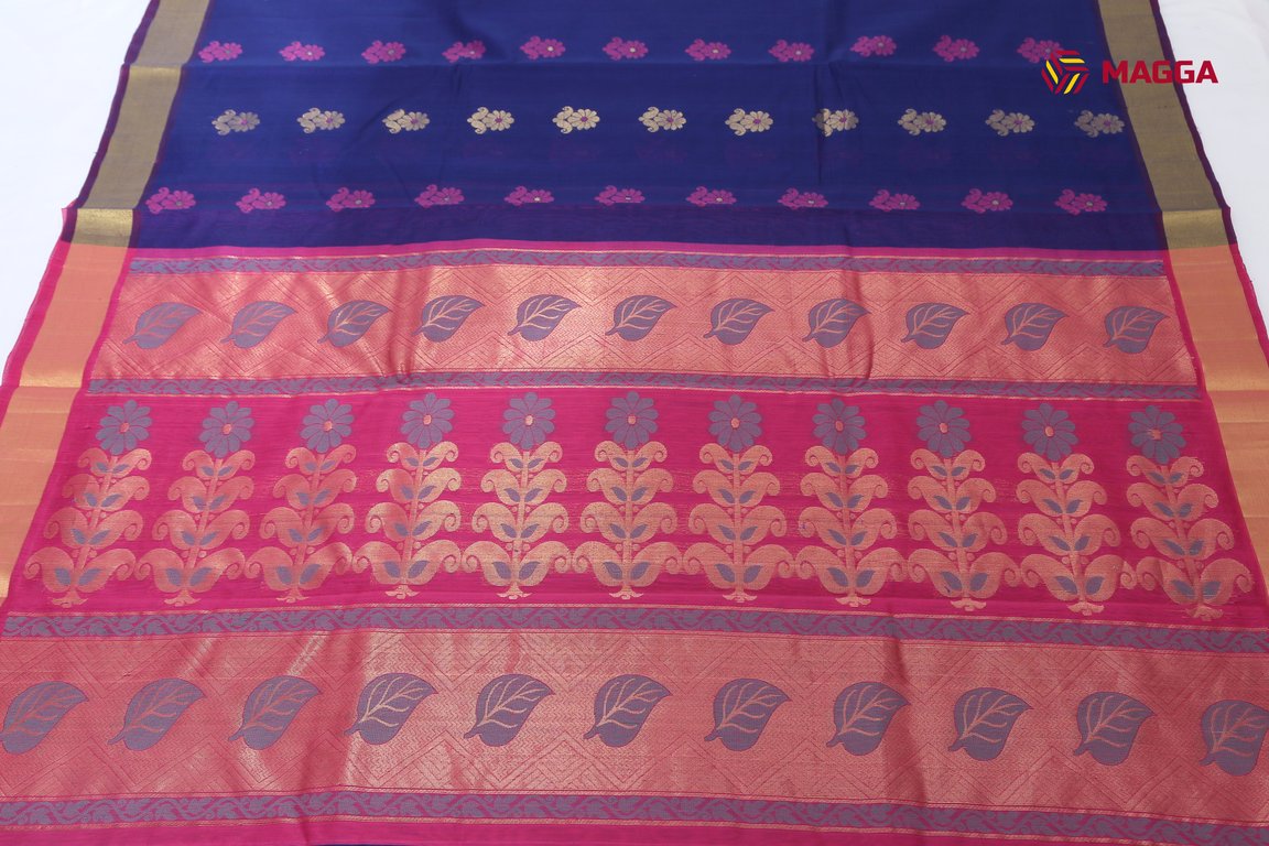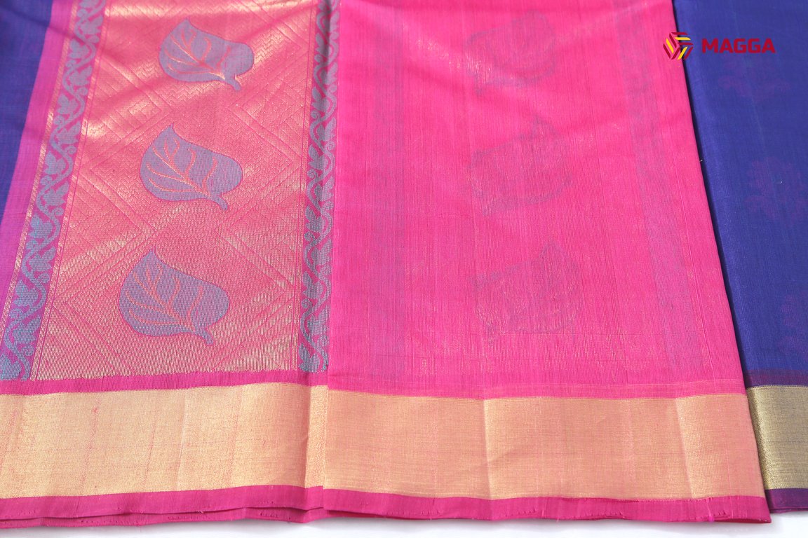 Dark Blue and Pink Handwoven Kora Silk Cotton Saree