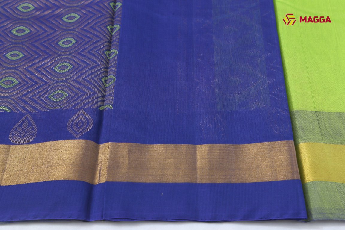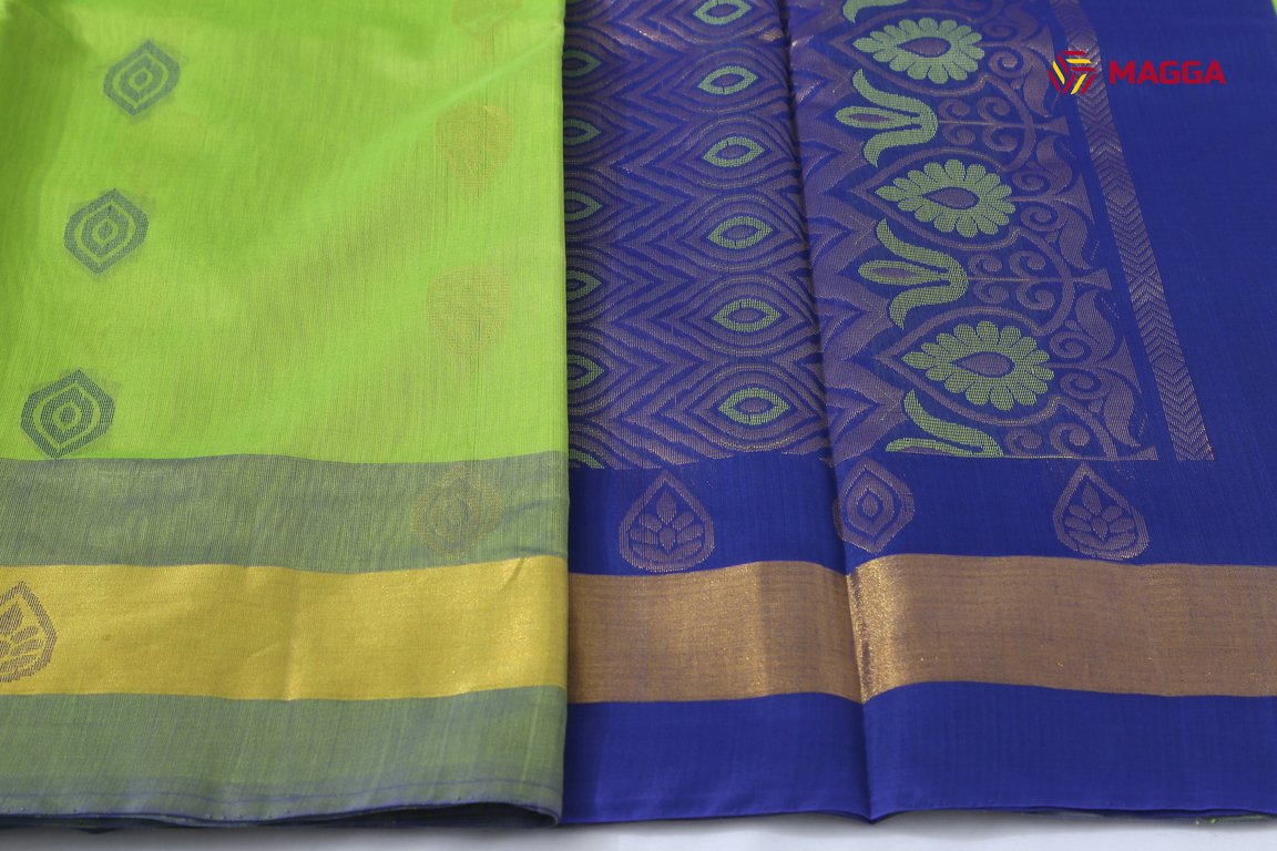 A traditional light Green and Blue Kora Silk Cotton Saree woven floral buttas all over body . This saree is handwoven with thick golden zari border and heavy rich blue zari pallu paired with contrast blouse.